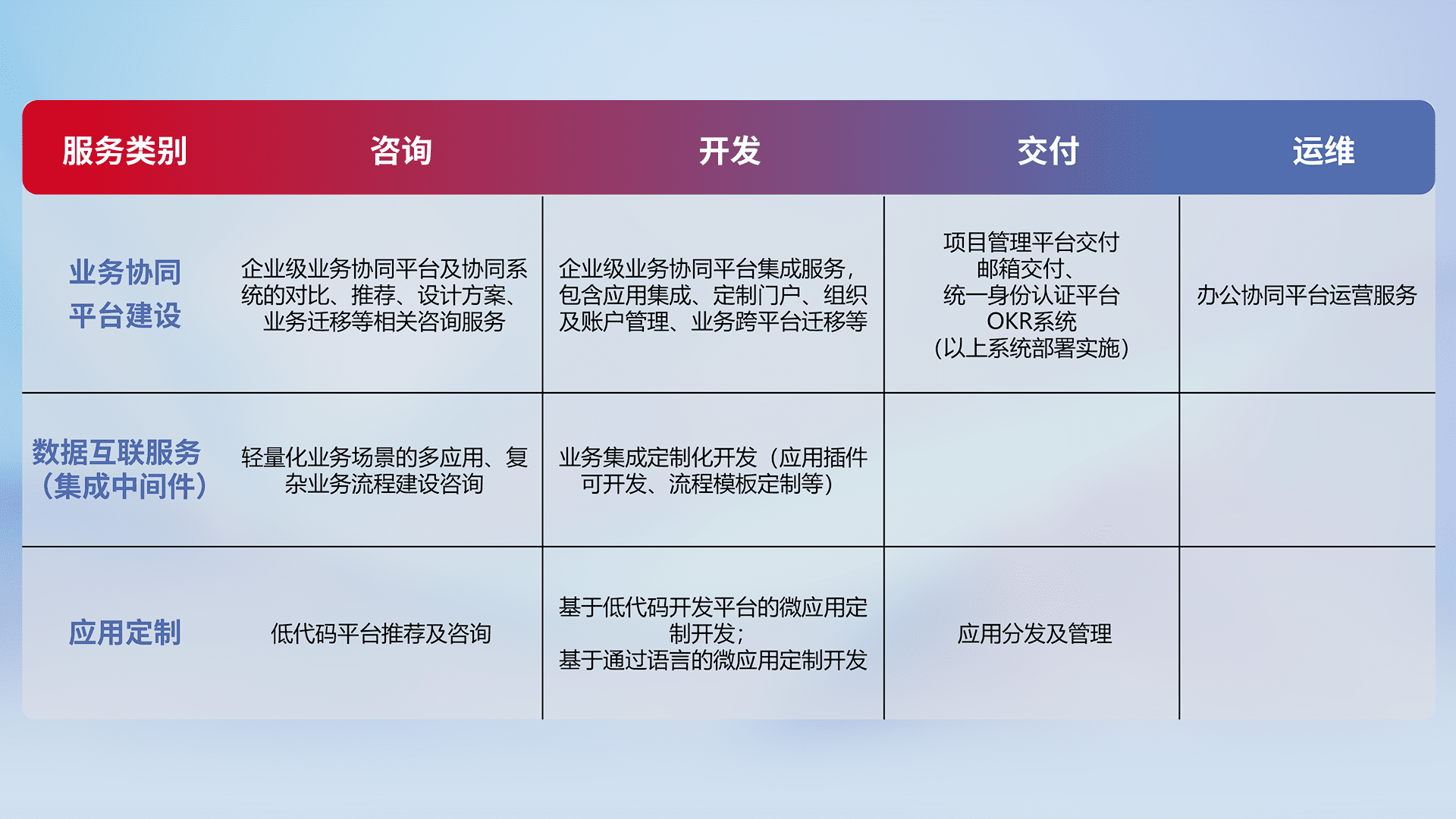 针对钉钉、、企微、、、IDaas等平台级产品提供产品的规划、、方案、、、、交付、、、定制化开发等服务,,实现如统一协同办公、、、、智能客户服务、、、混合会议管理、、、智能数据查询、、、、等业务场景,,,,实现数字化转型。。。。