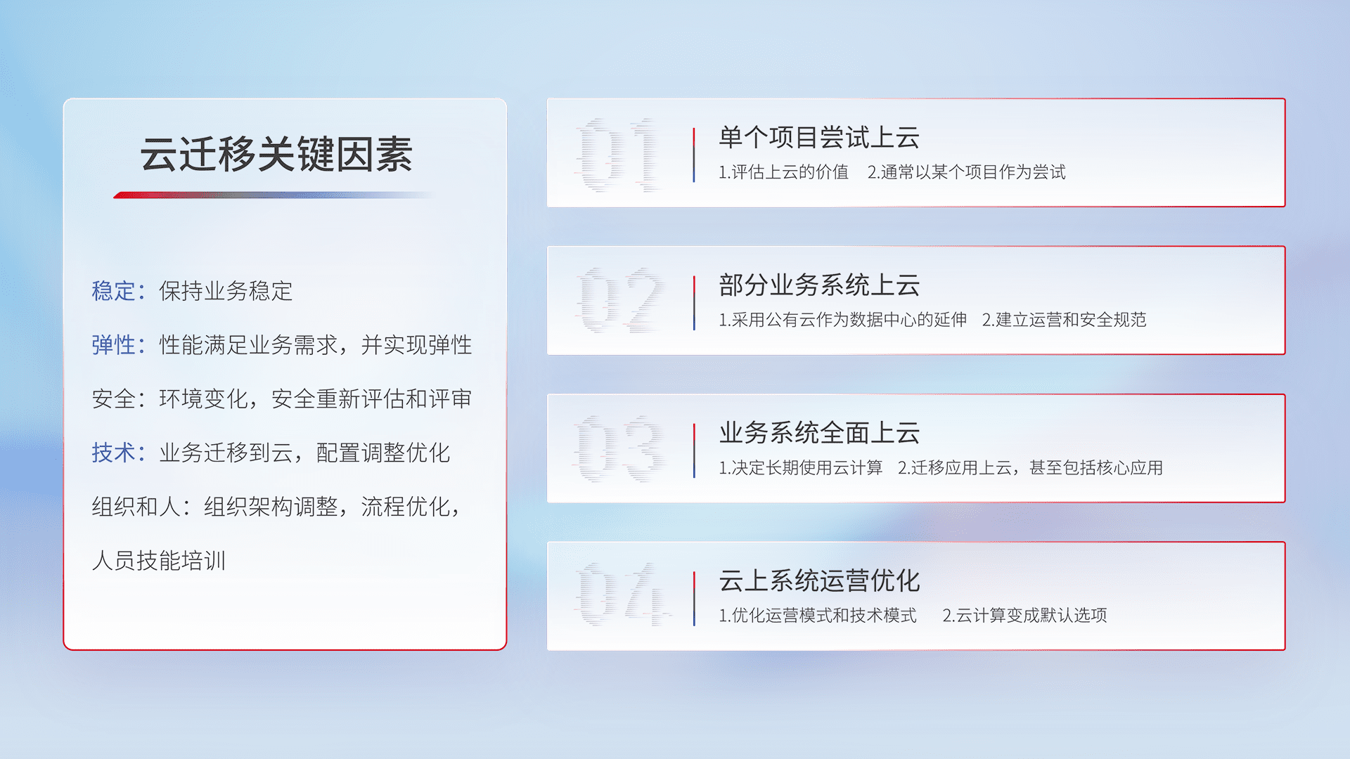 结合实际业务,,从规划设计、、、云平台选型、、、云原生改造、、数据迁移、、集成交付,,,迁移全过程为客户识别最佳上云路径,,,,做好风险识别管理,,,,设计网络架构、、、、身份权限、、、、安全审计合规、、、操作审计、、、、日志审计、、、监控告警策略、、、多站点容灾设计等,,,对云上基础设施进行整体规划,,提升IT治理水平,,以满足弹性、、、、高可用、、高性能的需求。。。