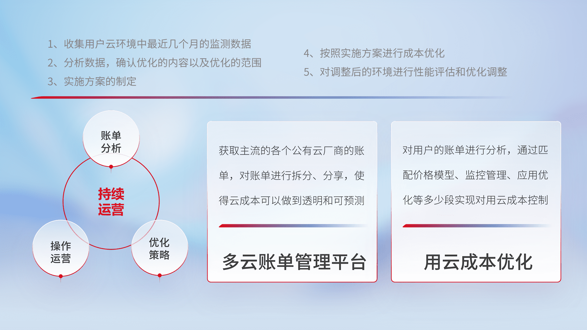 通过多云纳管,,,以统一的资源数据模型把客户的云资源进行抽象和封装,,进而实现对多云资源的统一操作,,,,保障云资源管理的可靠性、、、、稳定性与可用性。。量身定制化运维内容,,,配置、、、、开发运维、、补丁管理、、、、备份、、、监控、、、认证和访问管理、、、审计和日常巡检等,,,,保障在用云过程中的可靠度,,,稳定度以及高可用率。。。